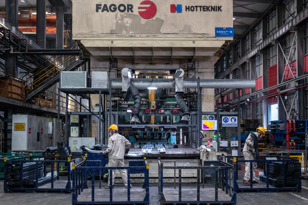 在位于重庆市两江新区的一家机械设备生产企业的热压车间,工人将刚下线的零件装箱(2023年7月16日摄)。新华社记者储加音摄