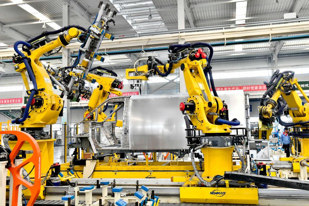 在山东邹平魏桥轻量化基地宏奥全铝车身集成生产车间,工业机器人在流水线上作业(2023年9月13日摄)。新华社记者郭绪雷摄