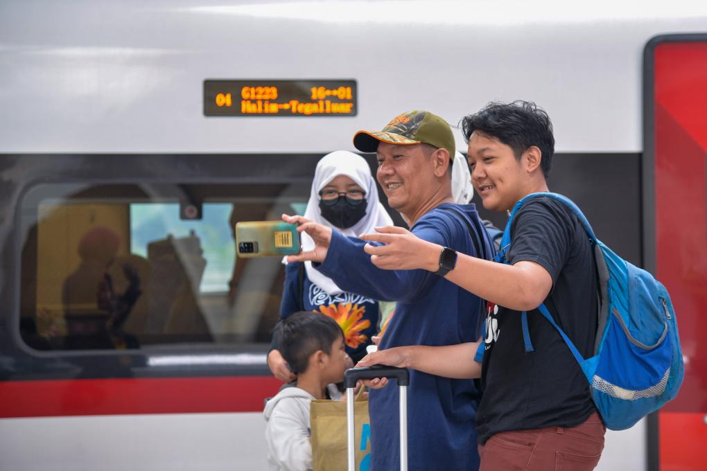 2023年12月25日,乘客在印度尼西亚雅加达的哈利姆车站站台与雅万高铁高速动车组合影。截至12月24日,作为中印尼共建“一带一路”合作的“金字招牌”,雅万高铁累计发送旅客突破100万人次。