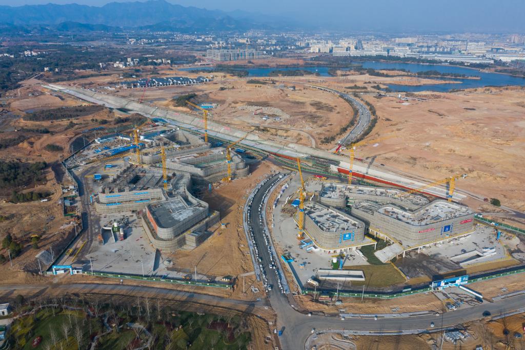 1月3日,空中俯瞰金华市金义新区金漪湖科技创新策源地重大基础设施项目施工现场(无人机照片)。新华社记者徐昱 摄