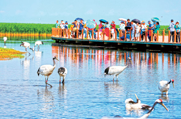 ▲2023年6月28日,游客在黑龙江扎龙国家级自然保护区观赏丹顶鹤。新华社记者石枫摄