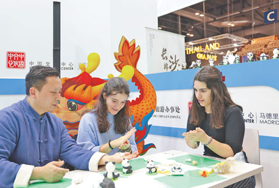 在中国展台,来自湖南的金杵面塑手艺人正在教观众基本的面塑技艺,制作大熊猫造型的纪念品。