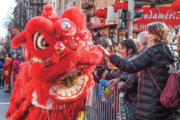 2月11日,在西班牙马德里,人们与舞狮演员互动。农历新年之际,全球多地举行“欢乐春节”活动。新华社发(古斯塔沃·巴连特摄)
