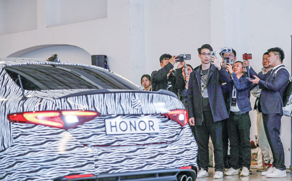 ▲2月25日,在西班牙巴塞罗那的世界移动通信大会上,荣耀产品经理林旭峰(中)展示眼动控车技术。新华社记者高静摄