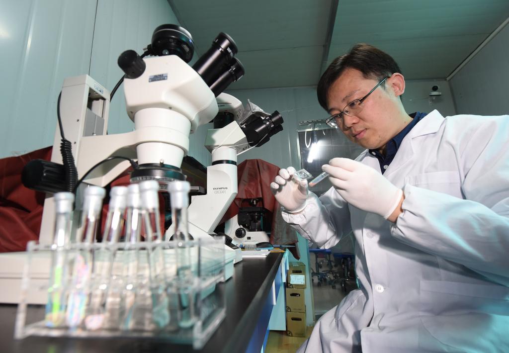 2018年4月2日,中国东南大学生物科学与医学工程学院赵远锦教授在进行“心脏芯片”的后续研究。新华社记者孙参摄