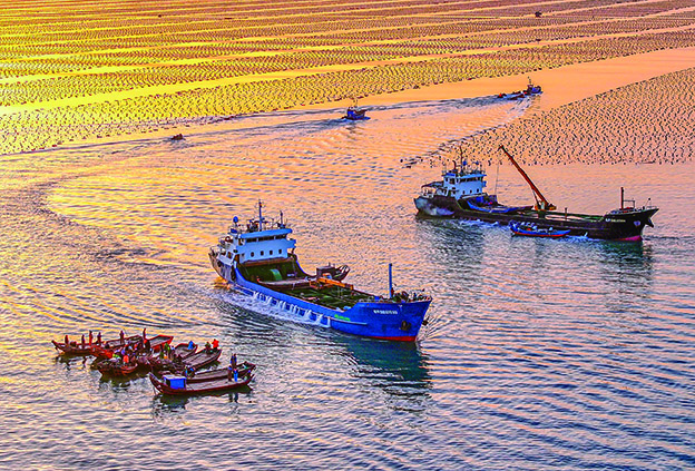 四月十七日,在山东省荣成市爱伦湾海域鲍鱼港,养殖工人在卸运鲍鱼,新华社发(李信君摄)