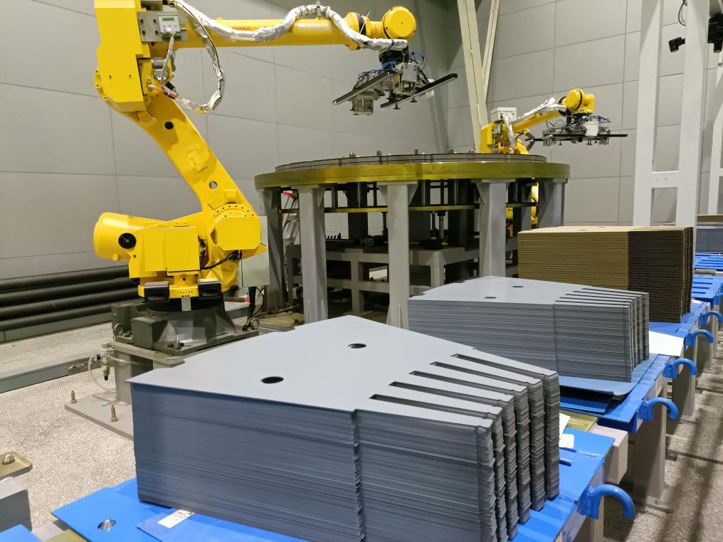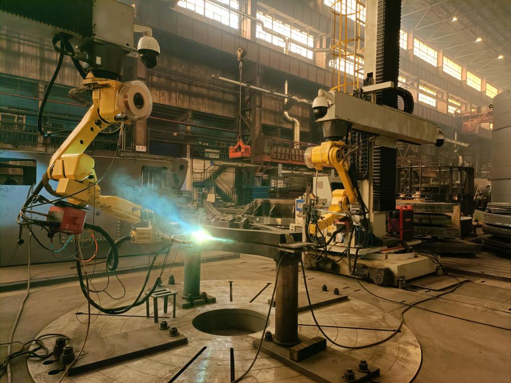 在哈电集团哈尔滨电机厂有限责任公司冷作分厂,蓝色的弧光在焊花飞溅中“狂舞”,冰冷与炽热交织在一起,自动焊接机器人在巨大的厂房内“忙碌”……