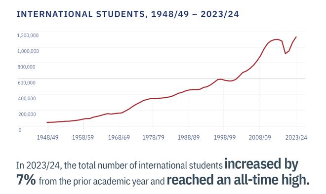 2023/2024学年,共有112.669万名来自世界各地的留学生在美国各类大学就读,创历史记录,同比增长6.6%,这也是继2020/2021年以来连续第三年增长。