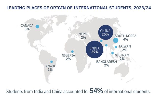 来自印度、中国的留美学生之和占据总国际生人数的54%。图源:IIE