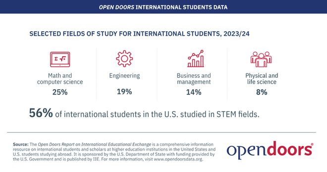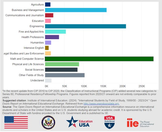 在美超过一半留学生(56%)选择在 STEM 领域学习,数学和计算机科学在 2023/24 学年继续成为留学生的主要学习领域。