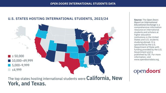 报告还显示,加州、纽约州和得克萨斯州接收的国际学生数量最多,44 个州的国际学生数量均有所上升。