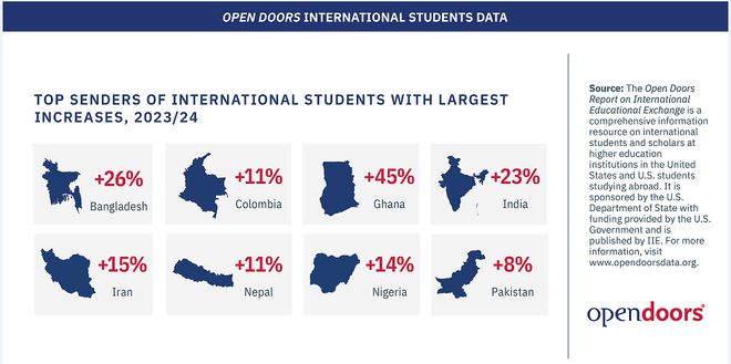 在 2023/24 学年中,美国国际学生的十大来源地分别是:印度、中国大陆、韩国、加拿大、中国台湾、越南、尼日利亚、孟加拉国、巴西、尼泊尔 。