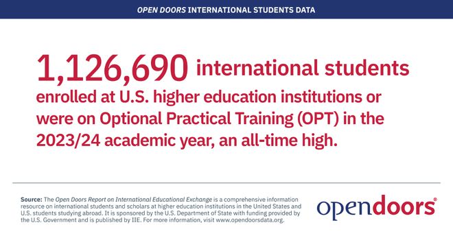 2023/24 学年,来自 210 多个生源地的 1,126,690 名留学生在美国高等教育机构学习,比上一学年增长 6.6%,占美国高等教育在读人数总量的 5.9% 。