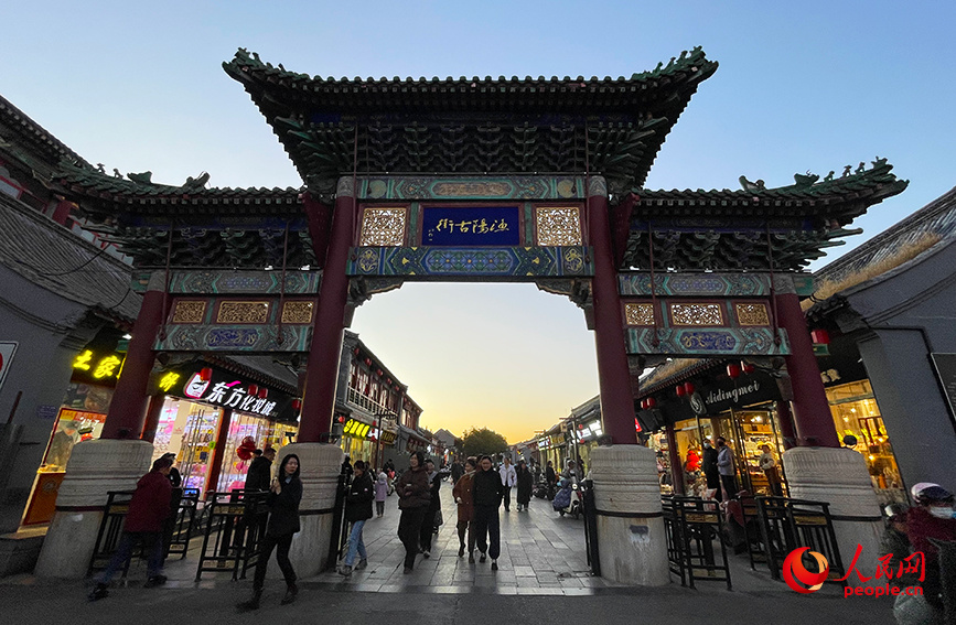 冬日晴好,蓝天白云,位于天津市蓟州区的渔阳古街洒满阳光,游客络绎不绝。
