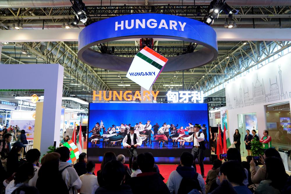 11月28日,人们在第二届中国国际供应链促进博览会匈牙利国家馆展台观看匈牙利传统民间文化表演。新华社发(那宇奇摄)