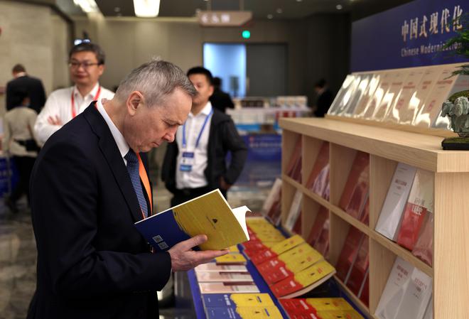 12月3日,2024年“读懂中国”国际会议与会嘉宾在会场阅读书籍。