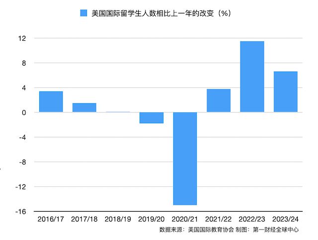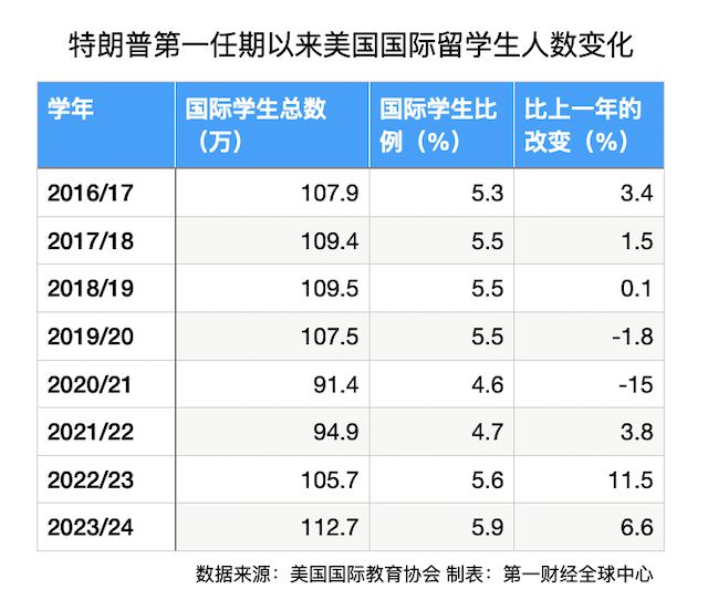 在特朗普第一任期内,根据美国国际教育协会的数据,美国国际留学生增长速度逐渐回落,从2016/17学年起的四年内增速分别为3.4%、1.5%、0.1%和-1.8%。