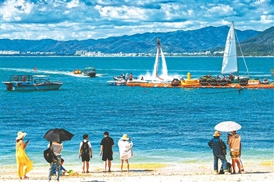2月15日,游客在海南省三亚市西岛景区体验海上游乐项目。韩 峻摄(人民图片)