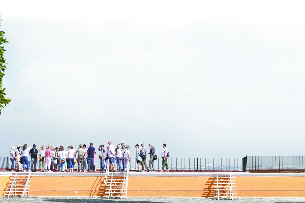 人们在济世圣母教堂的观景台上“探寻”金字塔没有被发现的秘密