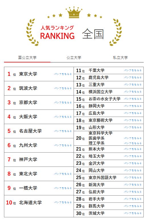 在国立大学中,东京大学毫无悬念地蝉联榜首,继续稳坐日本国立大学人气的头把交椅。