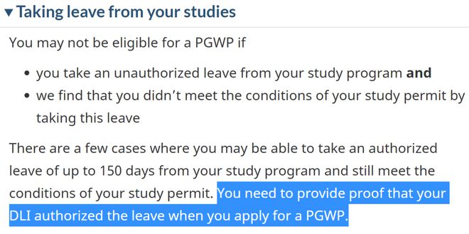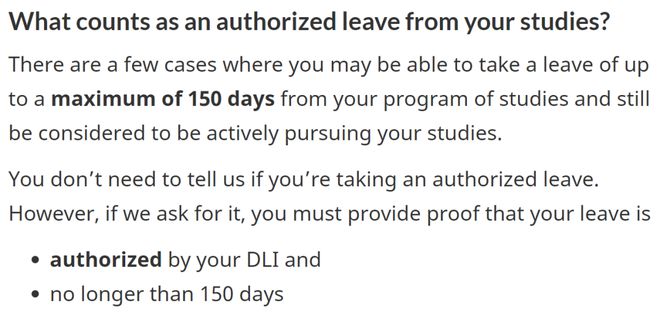 因为上面提过必须以全职学生身份就读并完成认可的课程才符合申请 PGWP 的资格,如果在读期间因为生病、停学或其他理由暂时休学的话,必须要获得就读院校的批准文件(Authorized leave documentation),学校出具的书面证明须在递交PGWP申请时一并提交。此外,休学时间不能超过 150 天。