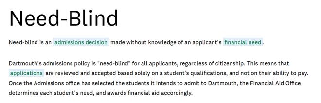 达特茅斯学院在 2022 年初宣布,将扩大其长期以来不考虑学生需求的招生政策,开始招收国际学生。学院对所有本科生申请人实行不考虑需求的录取政策,同时满足 100% 的经济需求,而不受国籍的影响。